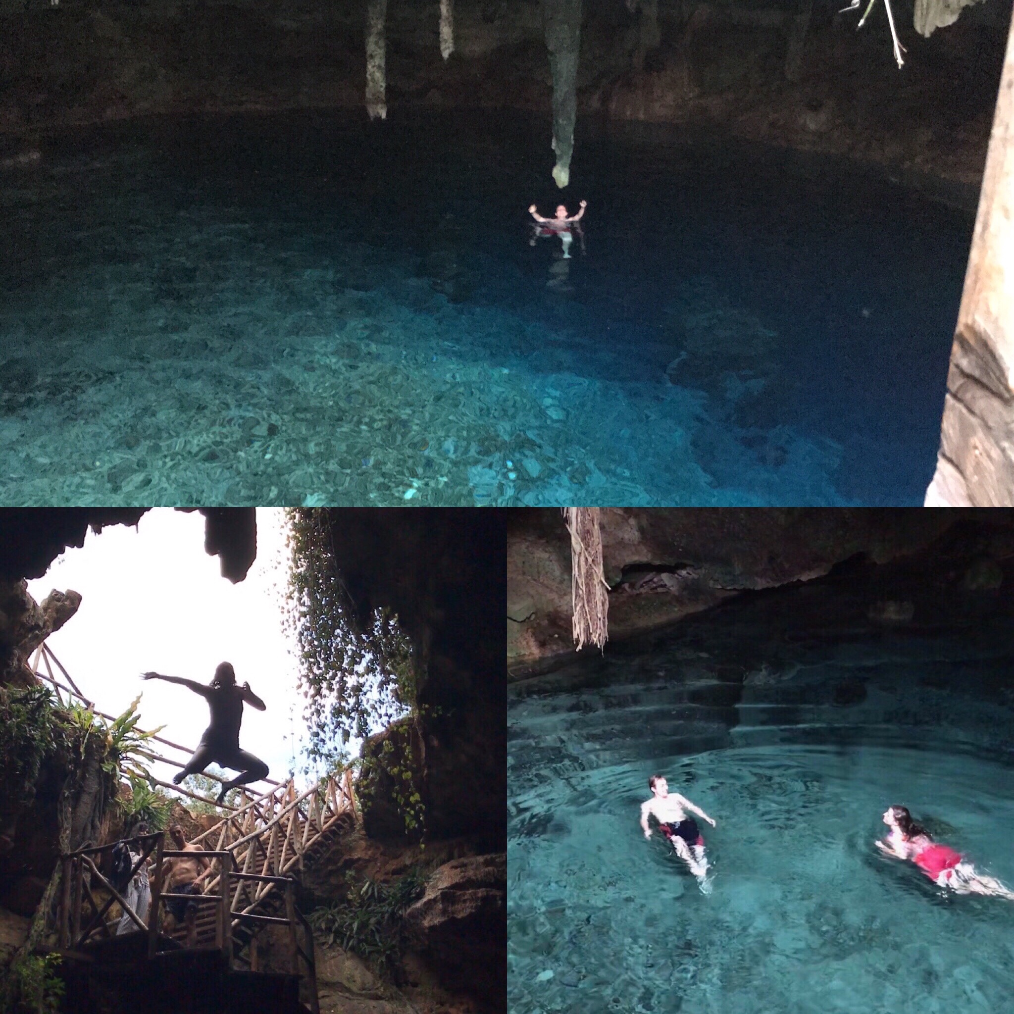 Visiting this cenote was a dream. Cenotes are water caves scattered all over the Yucatán. We had the whole place to ourselves and the water was crystal blue. The water was so smooth and clear, it created some sort of magnifying glass and made it look more shallow than it actually was. It was actually very deep. We climbed up on the viney staircase and jumped into the sapphire water. I liked hanging onto the stalactite when I got tired. Swallows swooped around like racehorses keeping the bugs down. The water was the perfect temperature cool and clean. We had a blast messing around this incredible natural swimming hole.
