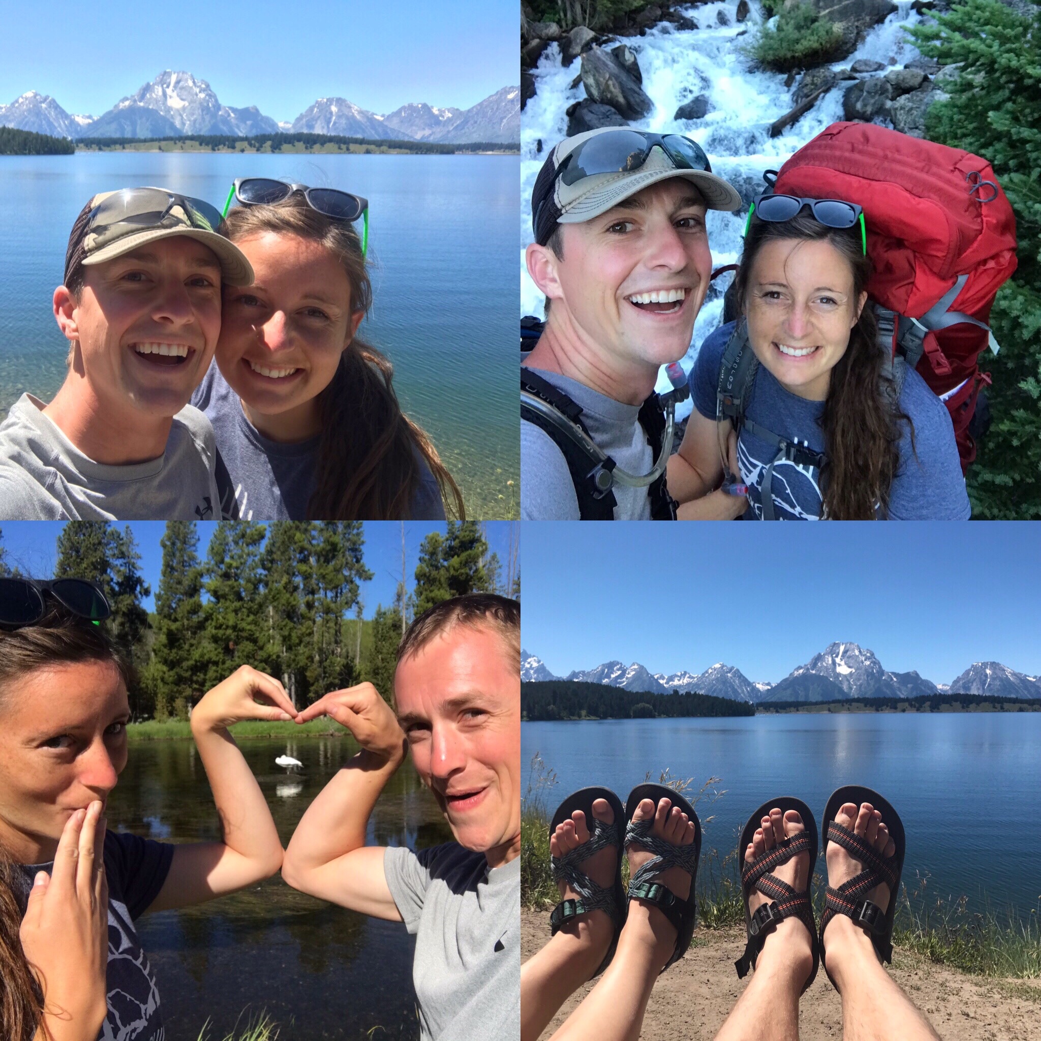We played around with this swan for a while on our way out of Yellowstone and enjoyed the drive into the Tetons. Wow, the vistas in the Tetons are so impressive! We snagged some stamps for our National Park passport and somehow got into the park without paying?! We passed a pay booth on our way out, but nothing on the way in. We stopped to see a grizzly bear with her cub and a moose with her fuzzy baby. We were lucky enough to snag a backpacking permit to the backcountry up an area called Death Canyon. After picking up our bear cans and packing up our brand new osprey packs, we hit the trail. Gorgeous!! A good part of the trail went alongside thundering cascades that commanded respect. We were so pooped by the time we got to the camping zone, we took the first available spot–8 feet from the camping ok sign. Felt SO good to snuggle in.