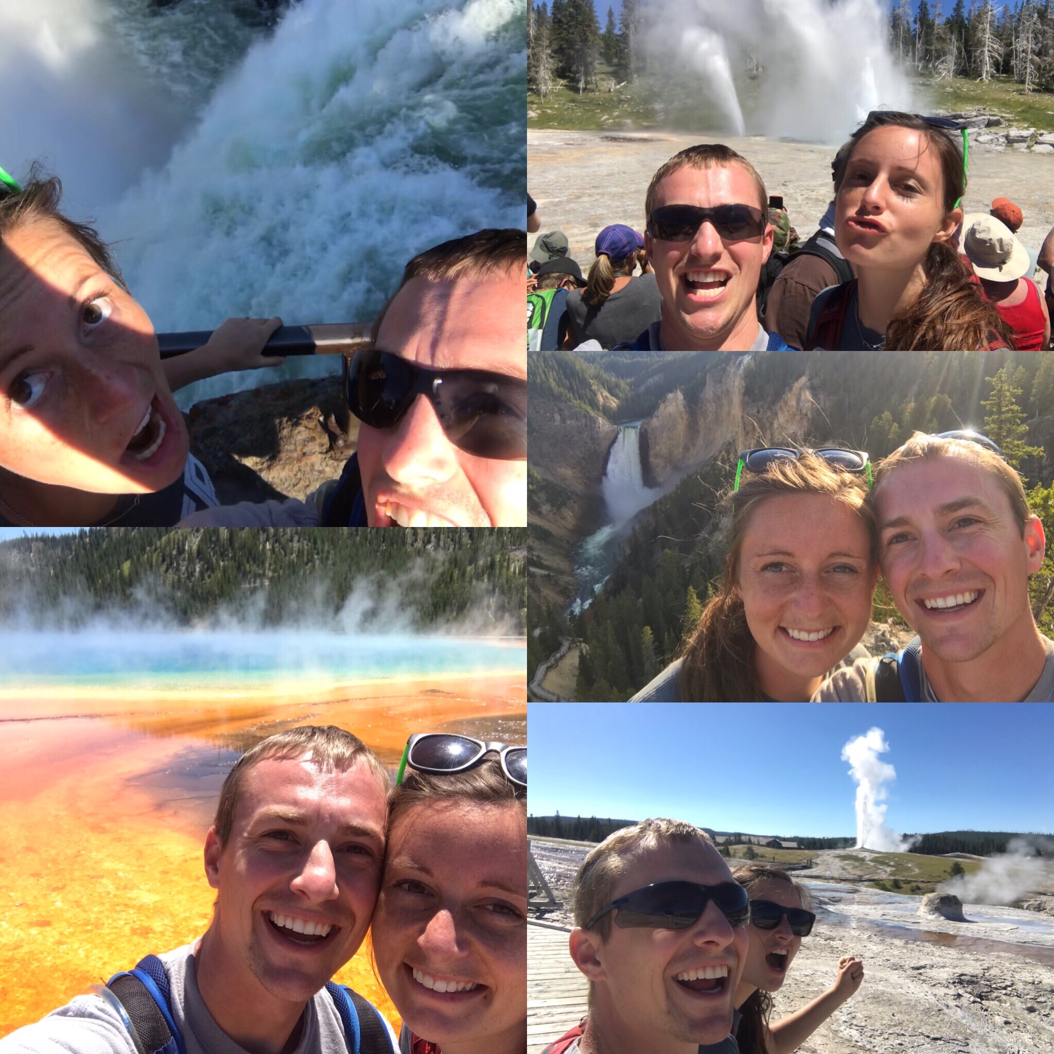 We jut had a grand ol’ time in Yellowstone! Driving in was absolutely iconic–geysers going off and a huge buffalo running across the road. The unmistakable smell of hot pots took me right back to when we came when I was a kid. Old faithful did not disappoint as it shot off right on cue. I actually liked one called Grand geyser better and we waited for about an hour for that one. We got a kick out of the mud pots that shot globs of goo up to 6 feet in the air with every bubble pop. We had fun trying to mimic the geysers and laughing at the results. We ventured into the northeast end of the park and were blown away by the powerful waterfalls there. Mountains of water just fell off these cliffs with insurmountable force. These big bugs were flying around over the falls and would dive in and get shot out under the water. We spent the evening driving the remote areas looking for animals and saw a bunch of buffalo and just missed a black wolf that folks were watching. An excellent day.